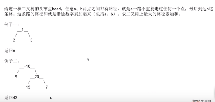 这个题用到递归套路。第一种情况不要头节点,返回左右两边的最大值,第二种情况要头节点,返回头节点+左边(不为空情况)和头节点+右边(不为空)和头节点+左边+右边(都不为空)的最大值。 - 返回一个数组,java是返回node,python怎么搞明天搜一下。