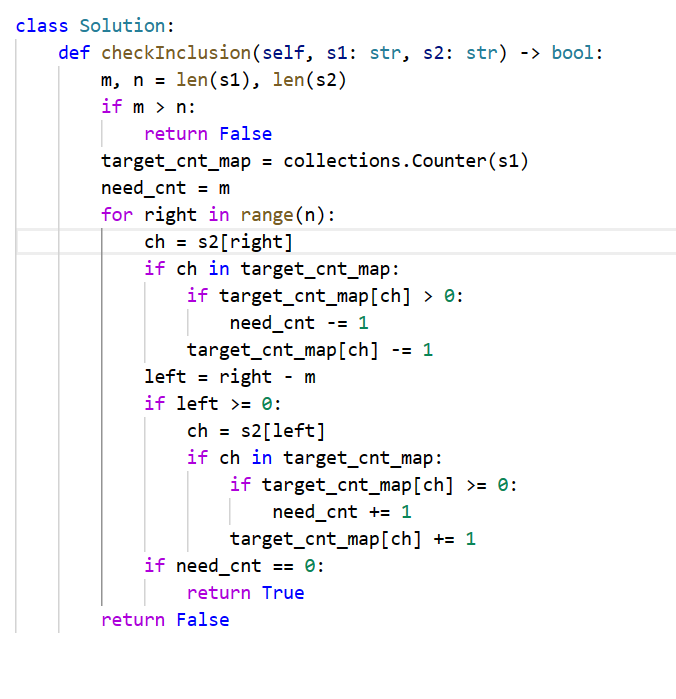 这个题也是滑动窗口,是一个固定长度的滑动窗口,一个cnt记录target词频,一个need记录需要多少个字母,然后滑动窗口,最后判断need是不是为0,滑动的时候要注意条件判断,看left和right在不在cnt内,不在cnt内就不用管。