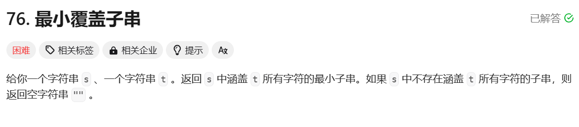 滑动窗口解决,滑动窗口模板要记住,不满足条件r一直往右,满足了l就左移找到最小的,然后判断能不能更新最小值,最后l右移重新开始移动r。need表记录需要哪些数字以及个数,needcnt记录t还需要多少个字母。