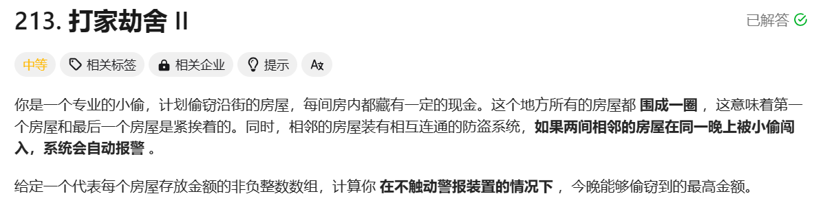 这个题就是当前dp值= 偷n-2个,第n-1个不偷,偷当前 + 偷前n-1个,当天不偷,用两个变量就能滚动起来,最后返回最后的值。 - lc213